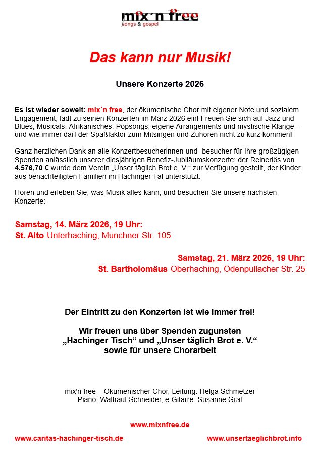 Eintritt frei - Spenden erwünscht - Die Spendeneinnahmen kommen zum Teil der Chorarbeit von mix'n free sowie sozialen Zwecken zugute.