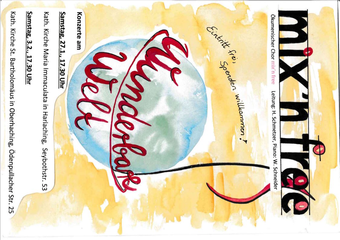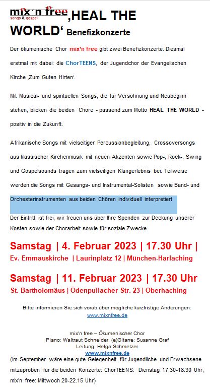 Der ökumenische Chor mix'n free gibt zwei Benefizkonzerte. Diesmal erstmal mit dabei: die ChorTEENS, der Jugendchor der Evangelischen Kirche "Zum Guten Hirten" Mit Musical- und spirituellen Songs, die für Versöhnung und Neubeginn stehen, blicken die beiden Chöre - passend zum Motto HEAL THE WORLD - positiv in die Zukunft. Afrikanische Songs mit vielseitiger Percussionbegleitung, Crossoversongs aus klassischer Kirchenmusik mit neuen Akzenten sowie Pop-, Rock-, Swing und Gospelsounds tragen zum vielseitigen Klangerlebnis bei. Teilweise werden die Songs mit Gesangs- und Instrumental-Solisten sowie Band- und Orchesterinstrumenten aus beiden Chören individuell interpretiert.