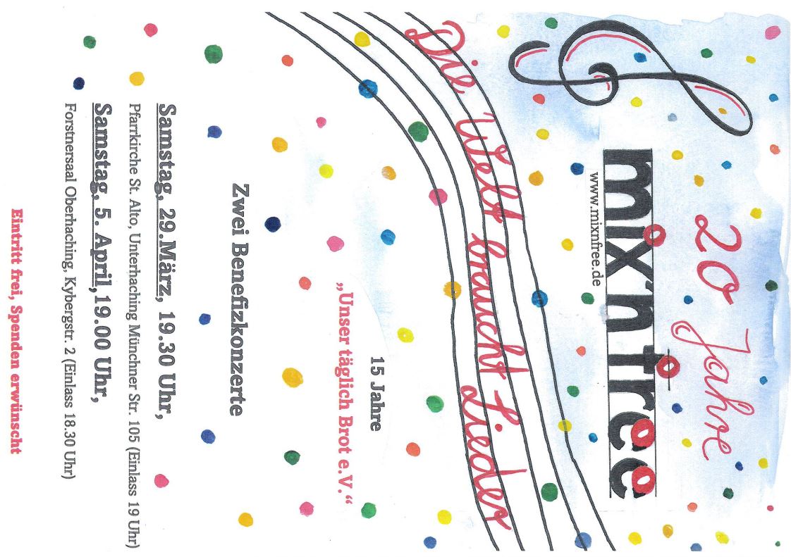 Juli 2011 Benefizkonzert zweier Chöre in der Kirche Zum Guten Hirten zum Thema "Nord und Süd gemeinsam auf der Notenleiter" mit dem befreundeten FABI-Chor aus Stade, zugunsten von Unser täglich Brot e.V. der Chor MIX'N FREE