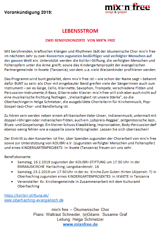Eintritt frei - Spenden erwünscht - Die Spendeneinnahmen kommen zum Teil der Chorarbeit von mix'n free sowie dem sozialen Zwecken zugute.