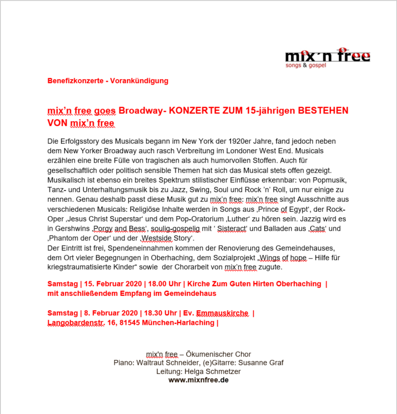 November 2008 2 Benefizkonzerte "Freie Fahrt für Musik" in der Kirche Zum Guten Hirten, Oberhaching und Bürgersaal Harthausen zugunsten bedürftiger Ortsansässige der Chor MIX'N FREE
