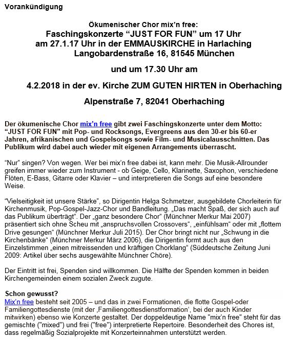 PRESSESTIMMEN: Stader Tagblatt November 2012 STADE. Dass die Bayern und die Norddeutschen gut zusammenpassen, bewiesen der Fabi-Chor der evangelischen Familienbildungsstätte Kehdingen/Stade und der ökumenische Kirchenchor "mix'n free" aus Oberhaching bei München bei einem gemeinsamen Konzert im Juli 2011 in Oberhaching (das TAGEBLATT berichtete).